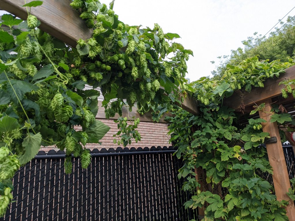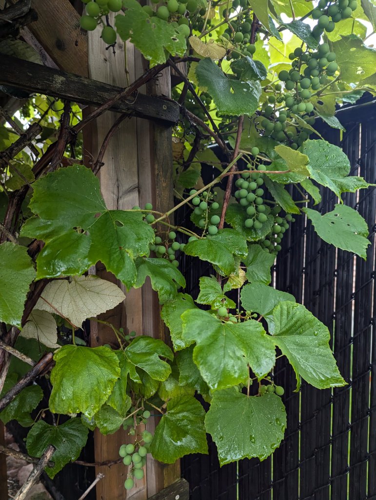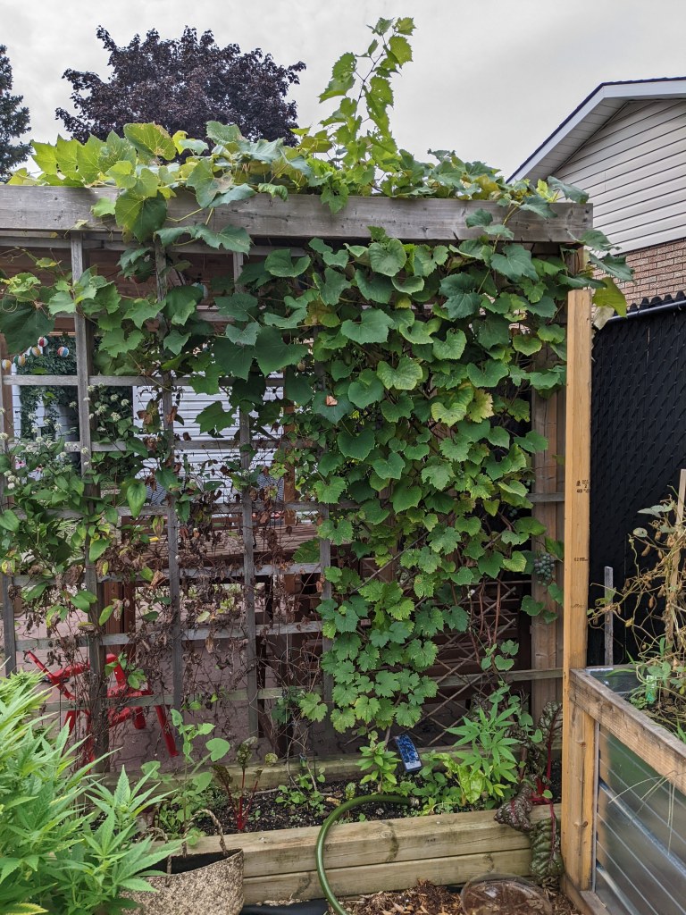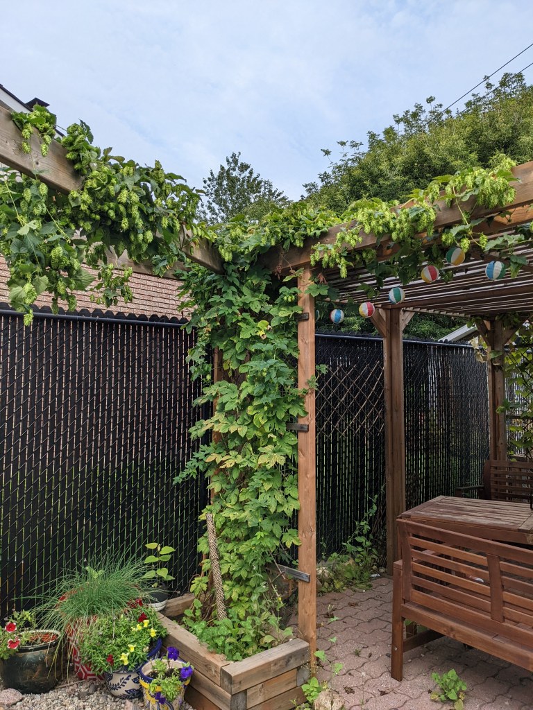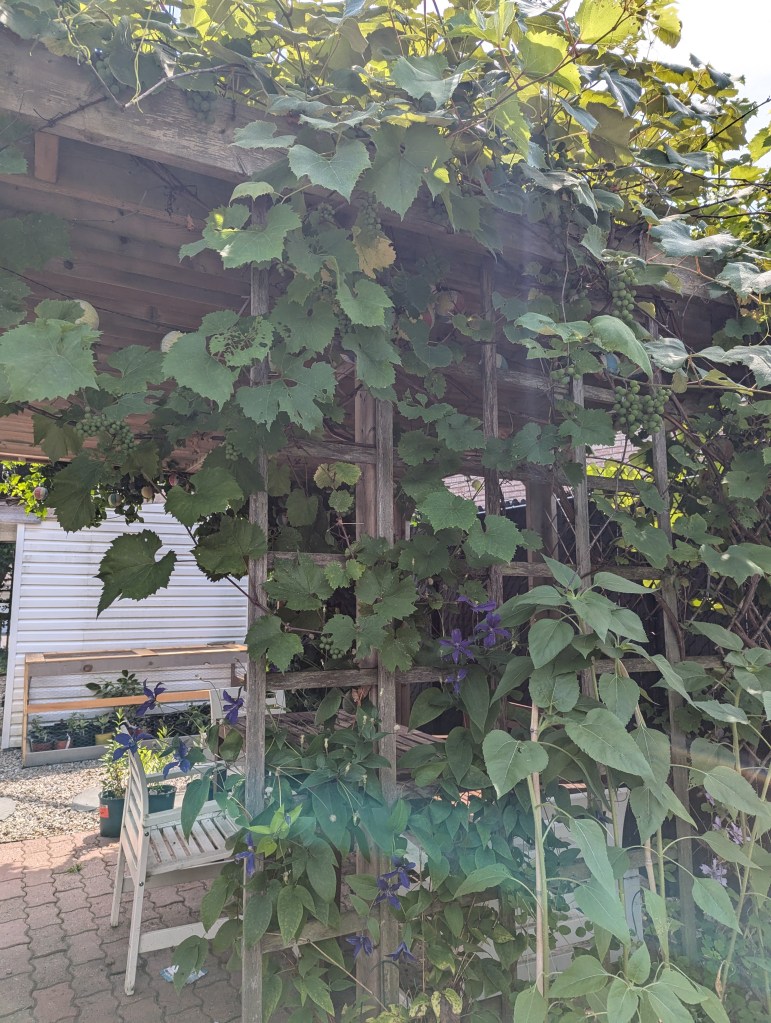 Our tiny backyard’s pergola homes 3 types of edible grapes and hops vines that provide shade and shelter from the rain, where large bunches of grapes hang from its slated roof and happily coexist and intermingle with beautiful clematis flowers, climbing peas and hop vines. The growth of these vines over the past 3 years has surprised me (in a good way), though I’m certain the enriched soil and optimal light conditions greatly contributed to this.