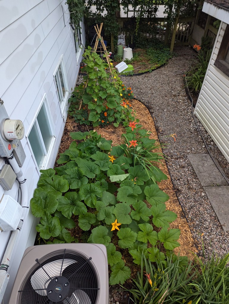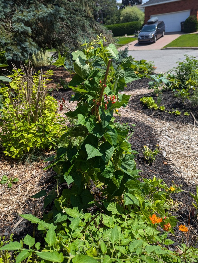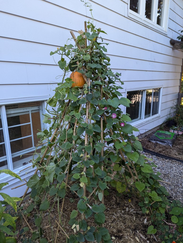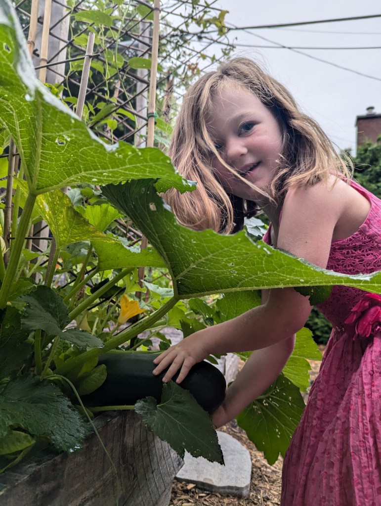 We also enjoy incorporating annual vegetables into larger landscapes, creating unique borders combining fresh herbs, beautiful foliage and texture among pollinator magnet flowers, and erecting simple and unique looking trellises for vined plants to grow vertically on and thrive in unexpected places. The ones below were experiments created this year using a bunch of bamboo poles and garden wire I had lying around. Our 4 year old adopted the cucumber trellis as her own tipi fort, and claimed ownership of the cucumbers growing from it, taking care to check and harvest them daily all summer long (and we’re still picking cucumbers in October!)