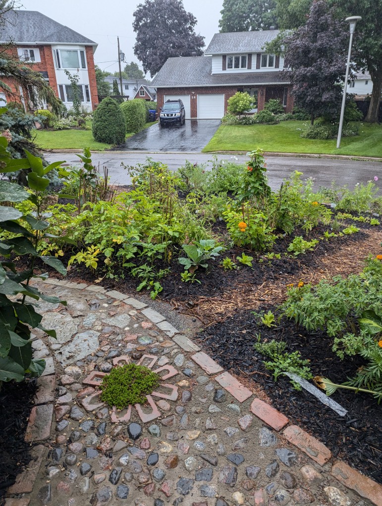 I think it took us about 3 weeks to get to this point, and with this work I found we had essentially tripled the available space I typically have for vegetables and herbs. We built some other funky rock paths along the house, leading to the backyard, and I focused my planting efforts this year in this new “side-yard”. And check out the results, and transformation of this space, in 6 months.
