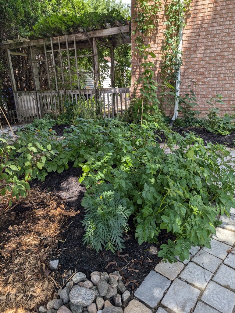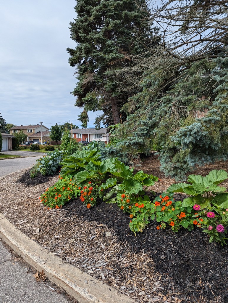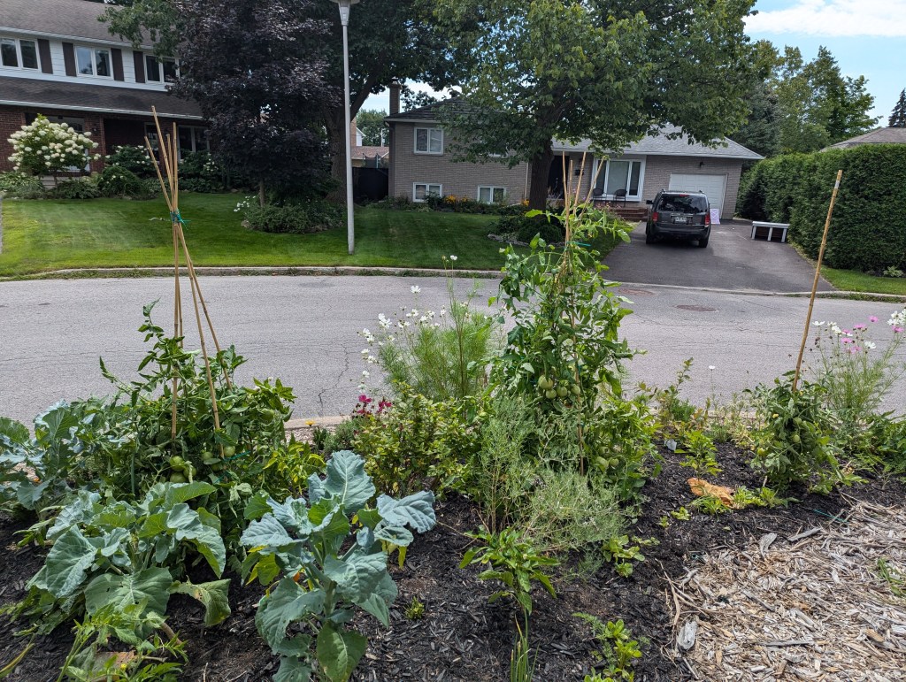 It’s hard to believe a 6 month old garden can look this full, but there was NOTHING here except crabgrass and creeping weeds in April when we started. The organic soil amendments played a huge part, as they began breaking down slowly and releasing nutrients for the plants as their roots grew. I planted many perennial edible crops in these beds which took much of this year to establish roots, and should flourish next year. In the meantime, I used the large gaps to plant large crops of our favourite vegetables, and experimented with growing the same plants in different soil and sun conditions, with various companion plants, while also contrasting these with the same plants grown in our more traditional vegetable garden in the back-yard.