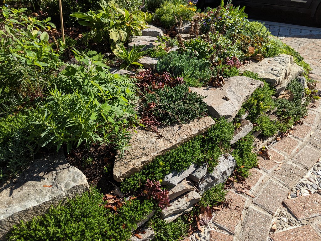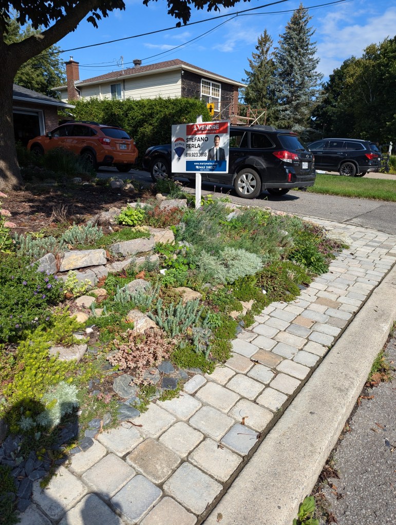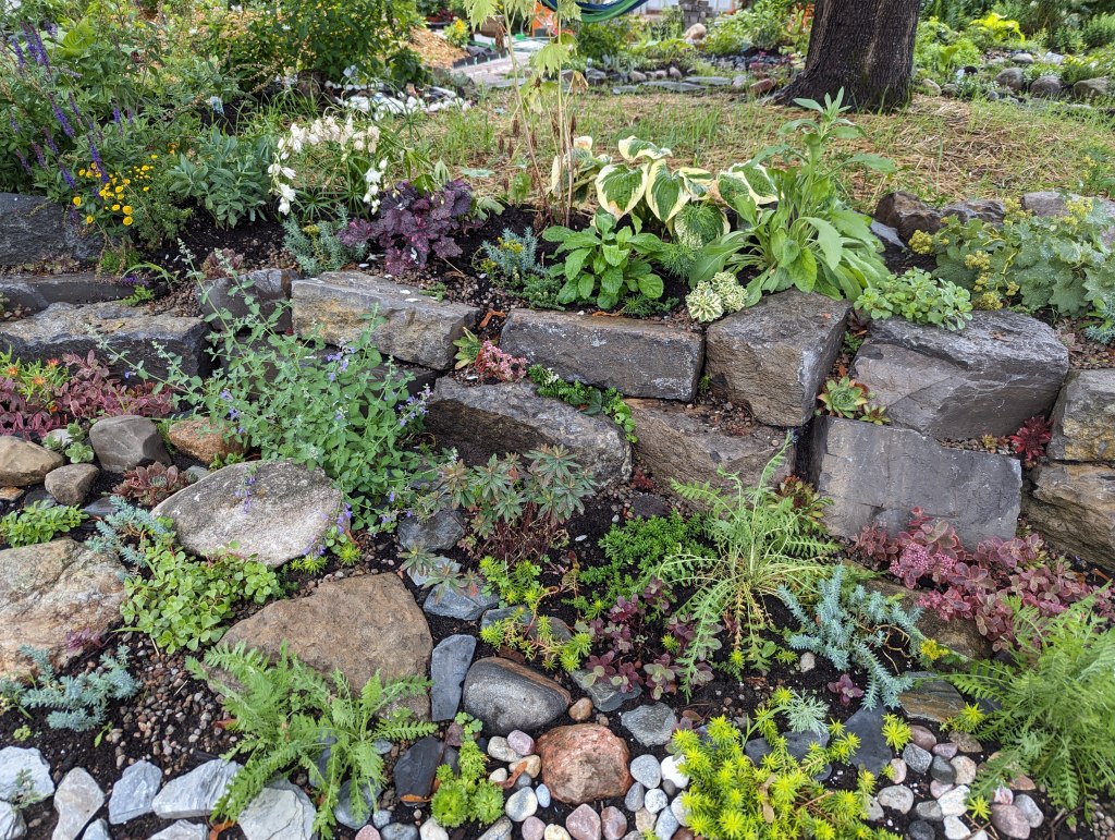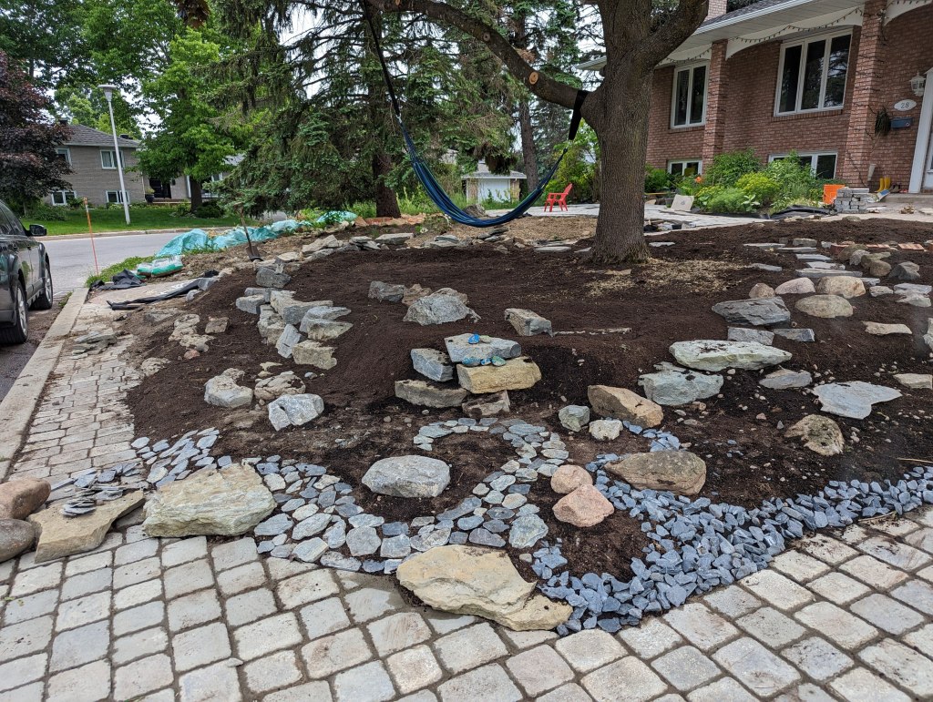 My solution for the space was to design a multi level rock garden, beneath the large Crimson maple that came with my house (would never be my choice of a front yard tree but it’s there and as old as my house so we roll with it).
