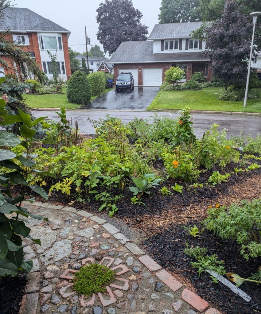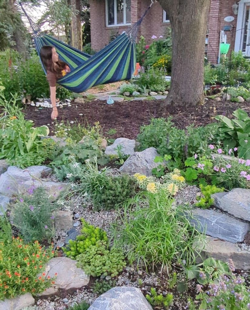 Our garden has become a somewhat unexpected wildlife haven. A family of robins nests here every year. We have squirrel nests in our hedges, and rabbits living under our trees shaded by tall shrubs. We have birds, bees and butterflies visit us all year round, and we never need to put seeds out in bird feeders anymore because the food they seek is abundant on our property, in any season. We gratefully share it with them. We have hammocks, benches, rain shelter and a beautiful sun patio all surrounded by plants, interspersed with vegetables and flowers where we can watch our garden visitors from. This is my current view from one such places as I write this.