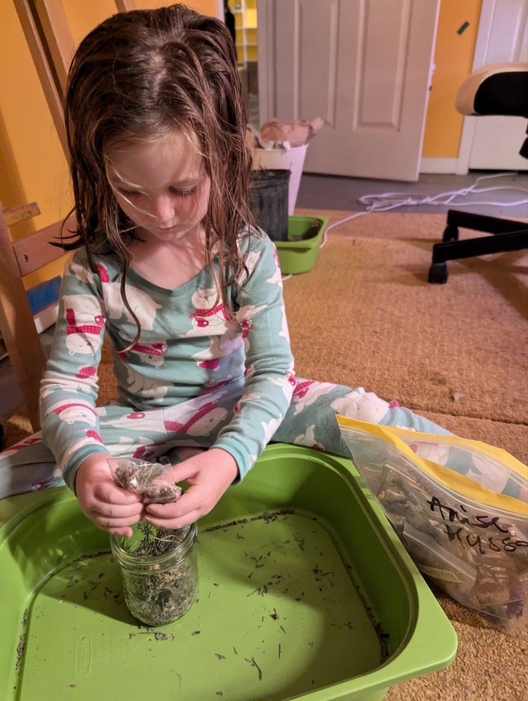 The kids decided on mixtures to treat 6 different ailments, starting with a unique problem they each wanted to solve. One was struggling with exam anxiety, another has dry skin, and the little one had trouble falling asleep and wanted to make a sleep potion. The garden hand mixture is for the cuts and scrapes they see on my hands, and they made the sore and headache mixes to solve what they see as grownup problems.