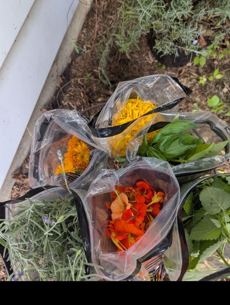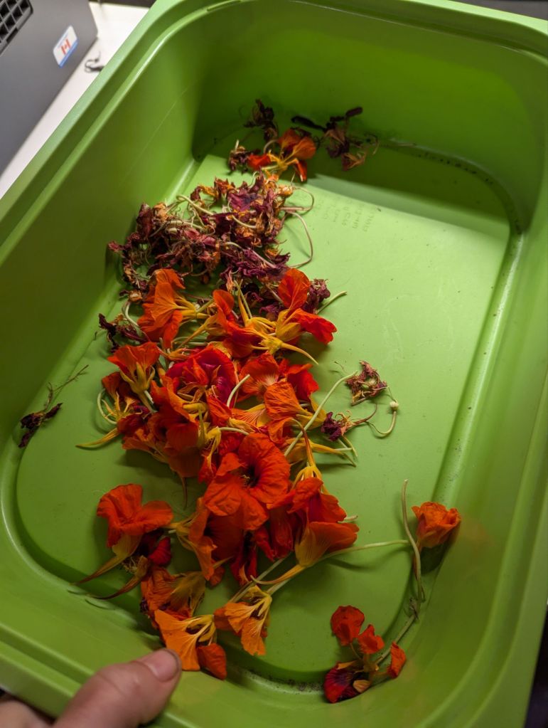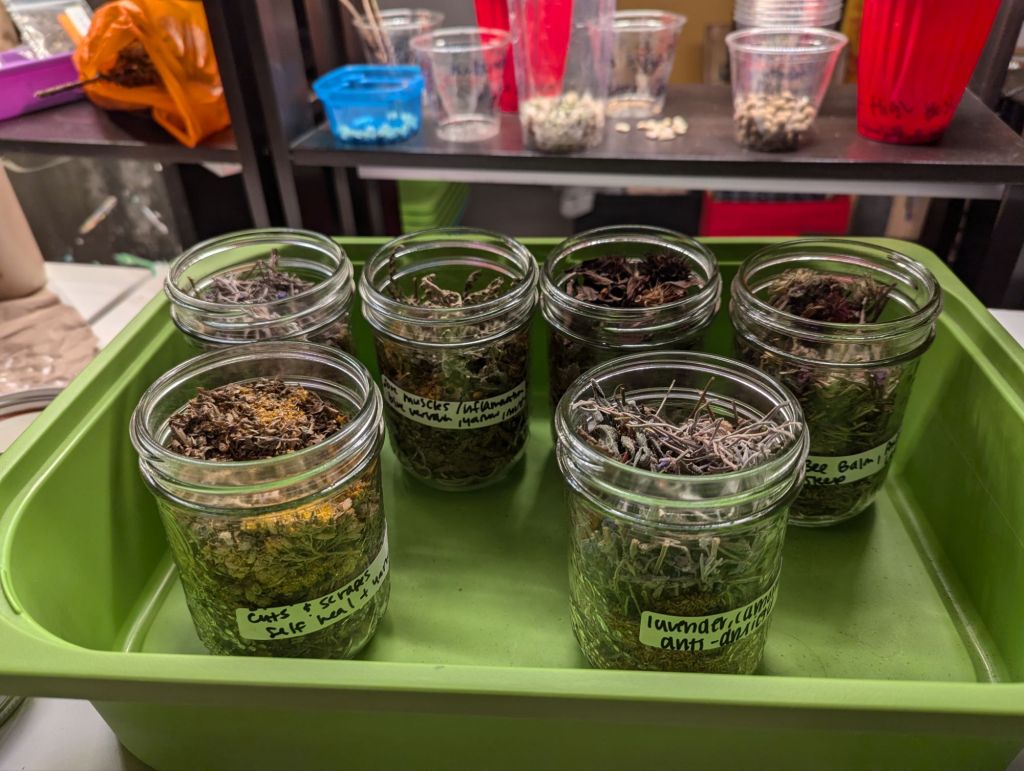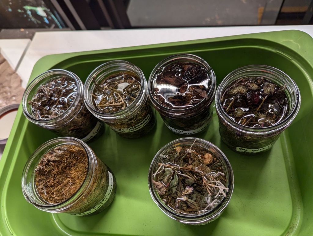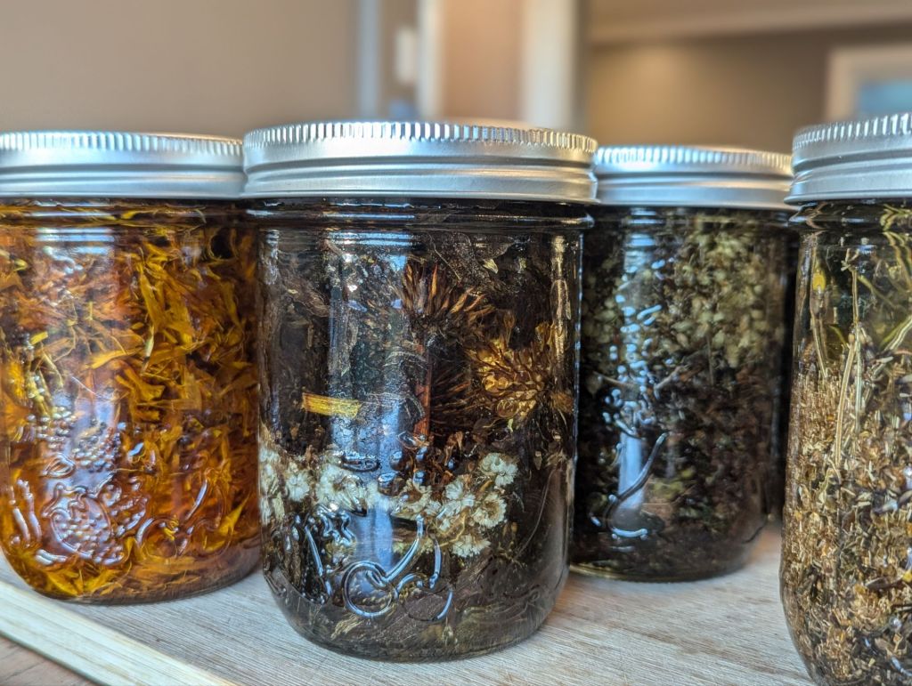 We saved and dried a lot of leaves and flowers this summer and fall, and the kids infused these in a mix of natural oils (avocado, olive and sunflower).