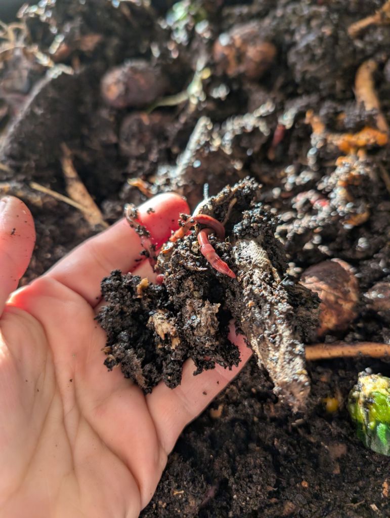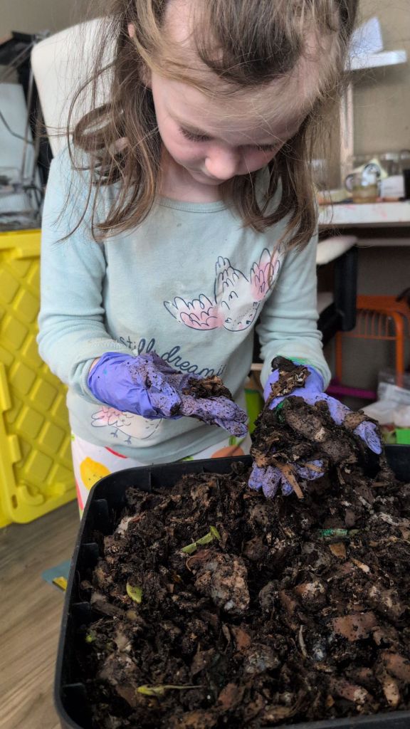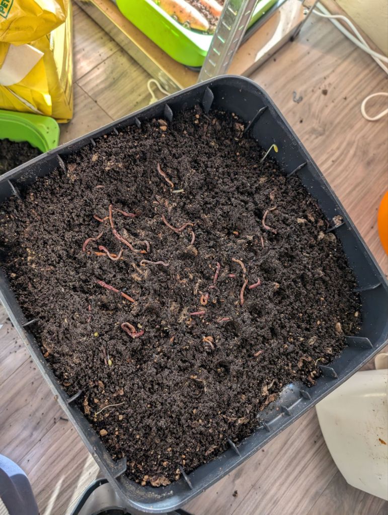We started it this fall, with a decent size bag filled with ‘red wriggler’ worms, picked up from a lovely lady on Marketplace who gave us some starting pointers on how to feed them and keep them alive.