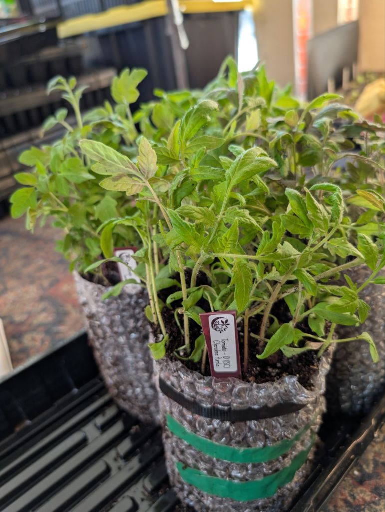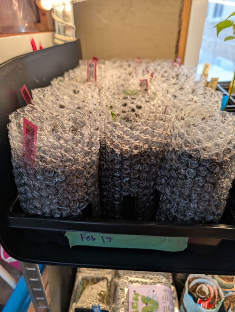 We planted seeds of each variety on February 17th, using the seed snail method, which I LOVE for starting seedlings indoors. I am using bubble wrap for the snails because we have so much of it leftover from our move, but also because I’m hoping it will help provide extra insulation for the plants when I move them out into our greenhouse (which is an ongoing project).