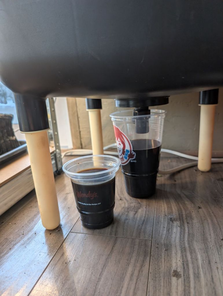 The excess moisture produced as they break down food collects in the bottom of the bin, and I release it with a tap. This is called compost tea, and we mix it into buckets when watering our seedlings.