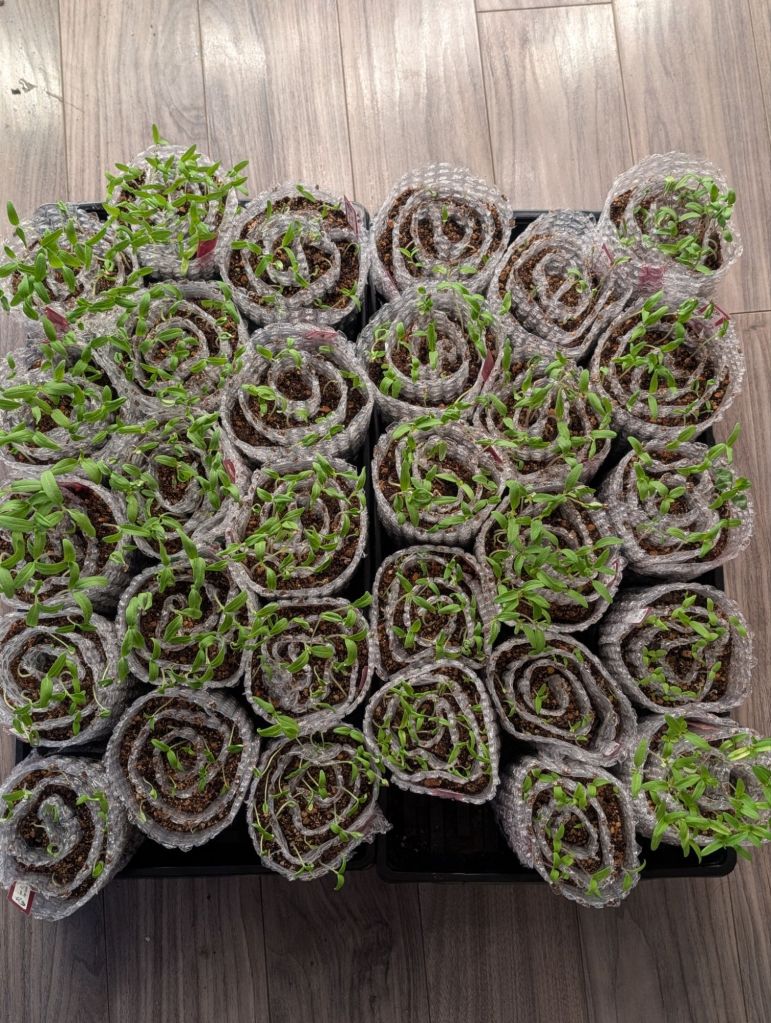 Yesterday I unrolled each soil snail, one by one, checking and feeding the roots of each plant, and burying the stems of the larger seedlings deeper.