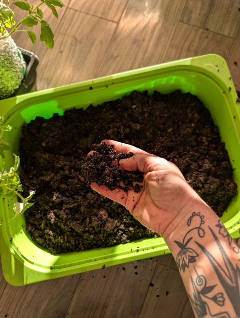 The worms also poop, a lot. When you buy expensive bags of worm castings, this is what they are. Worm poop. Ours is free, and contains ends of vegetables and fruit, banana peels, used coffee grinds, and other organic matter we discard. This is what I take from the worms to feed the tomato plants.