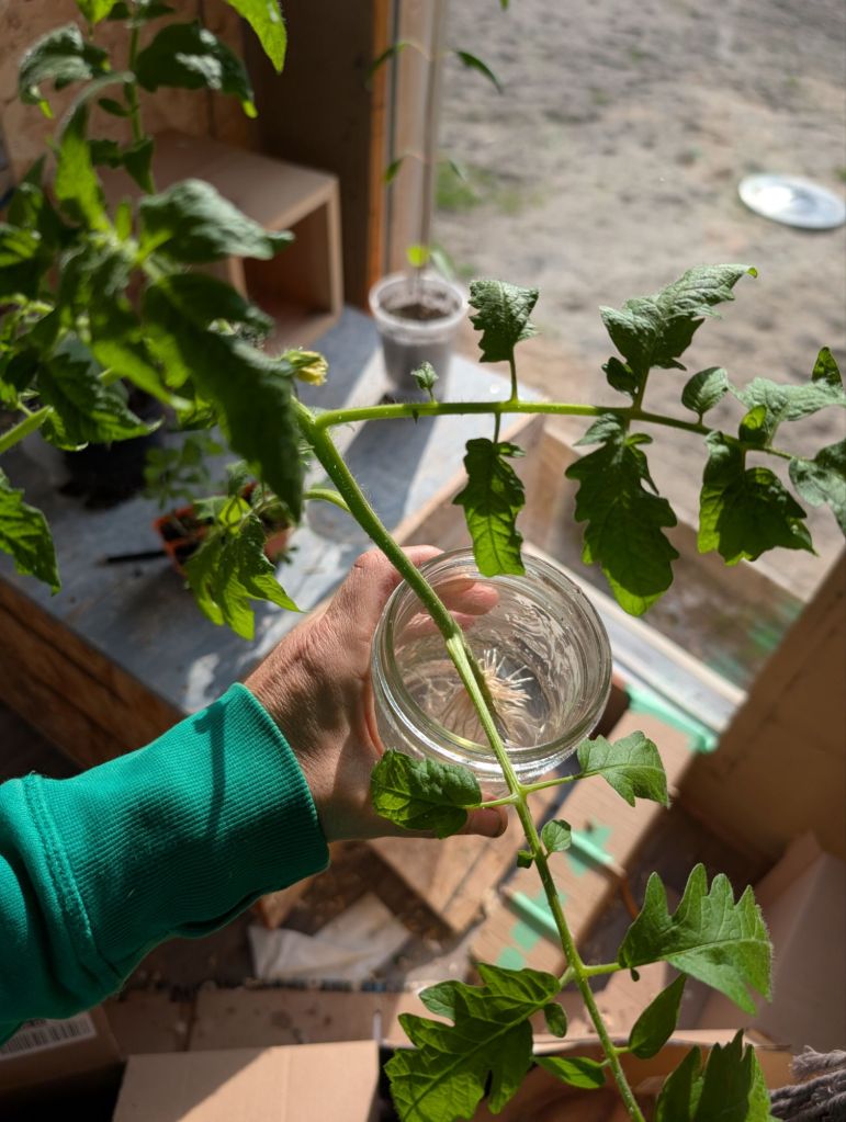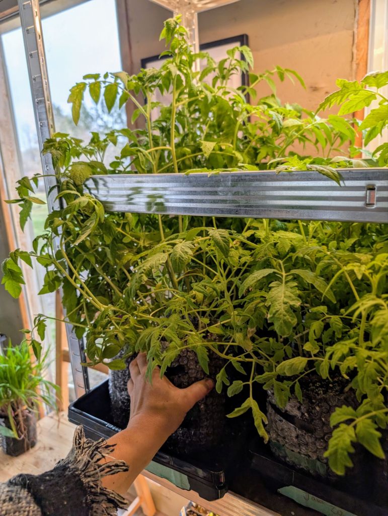 Fact: I started tomatoes waaay too early this year, because I was convinced that since I have a greenhouse I should move forward all planting dates by a month. My tomato seeds went into soil on February 17th. I’m not sure what I was thinking. They are an intertwined and overwhelming tomato forest now. I’ve had to remove shelves to keep them comfortable with access to light, and I am about to remove a second one.
