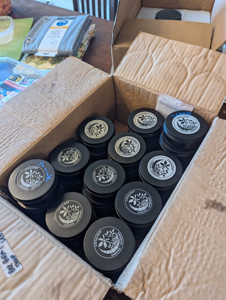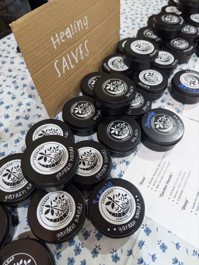 The salves are beautifully packaged, with care, also by the kids, and they are selling them for $20 each or 2/$35. They can deliver them anywhere in Aylmer. Please contact us through our website form, or Instagram @localeafgardens to purchase and arrange pickup or delivery.